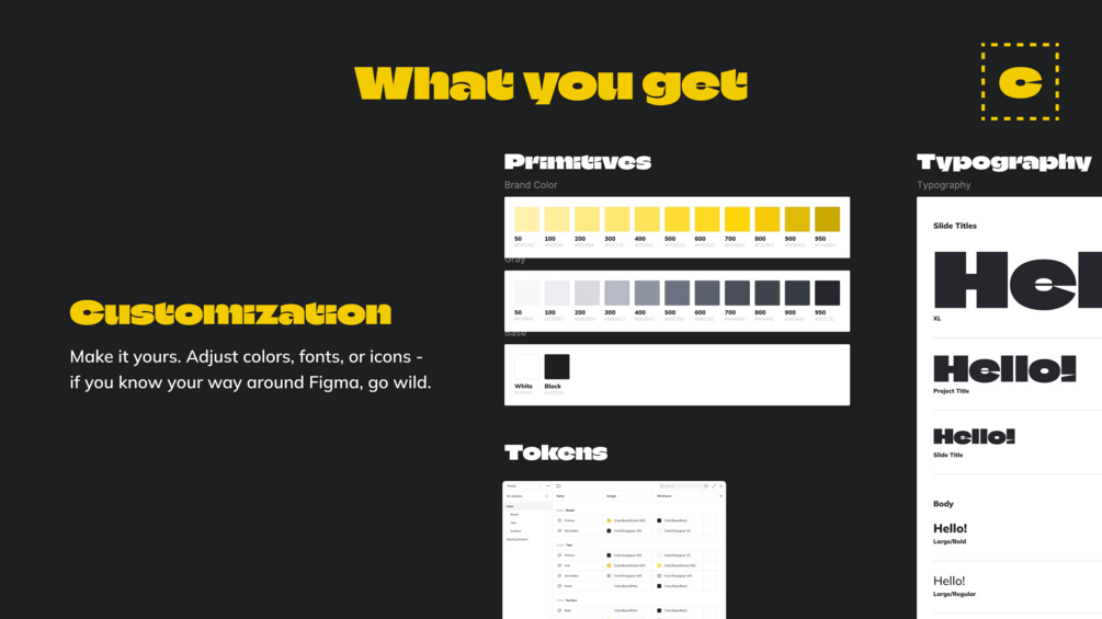 - Easily customizable – colors, typography, and tokens